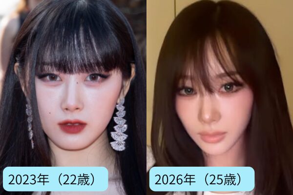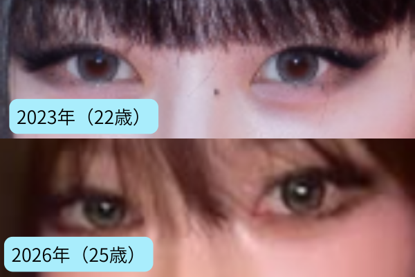 一方、2026年(25歳)の画像では、全体的に柔らかくナチュラルなアイメイクへと変化しています。