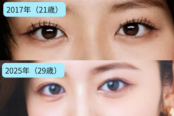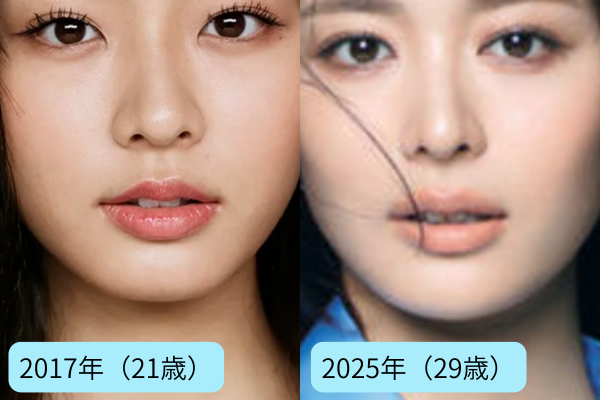 一方、2025年の画像では、アイメイクが洗練され、目元がくっきりした印象に変化しています。