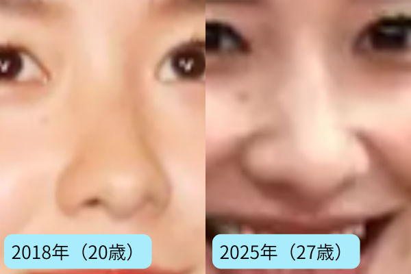 鼻先や小鼻の形は変化しておらず、成長とメイクの調整による印象変化が大きいでしょう。
