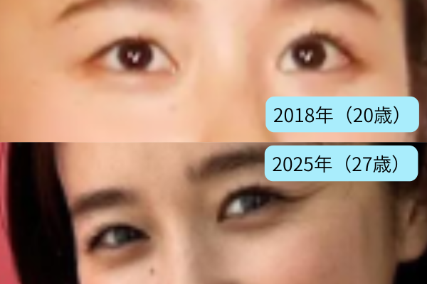 近年の写真では、アイラインやまつげメイクの強調によって、より切れ長でシャープな印象に変化しています。