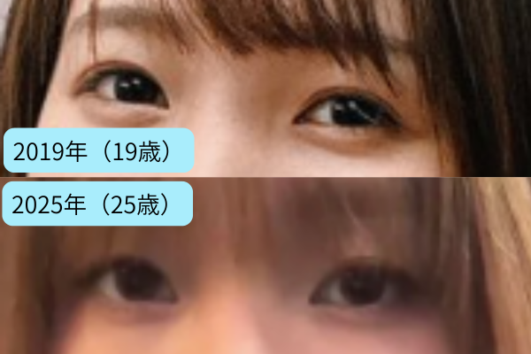 目元は相変わらず大きく、まぶたは自然な二重または奥二重に見えます。