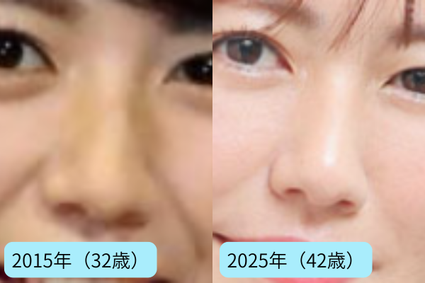 鼻についても、メイク・ライティングの影響で立体的な写りが増え、過去と比べて別人に見えることも。