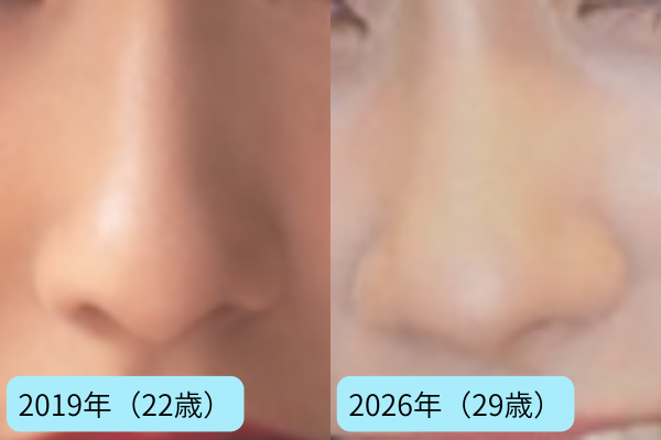 2019年(22歳)の頃と2026年(29歳)の現在の鼻を見比べてみると、鼻筋の高さや小鼻の広がり、鼻先の形などに大きな変化は感じられません。