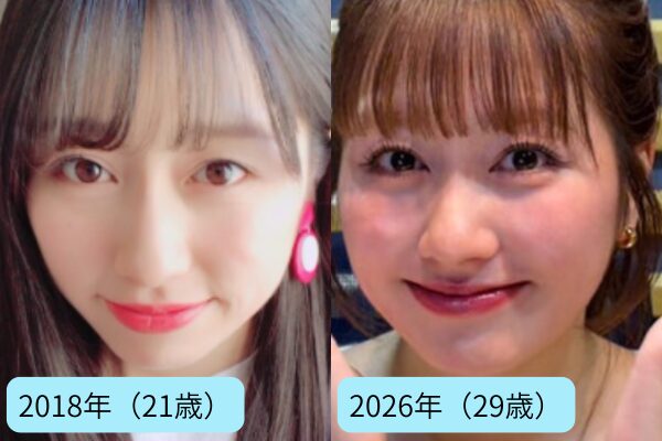 2018年(21歳)の頃と2026年(29歳)の現在の輪郭を見比べてみると、少し印象が変わったように感じるかもしれません。