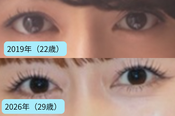 2019年(22歳)の頃と2026年(29歳)の現在の目元を見比べてみると、現在の方が、パッチリとした華やかな印象を受けます。