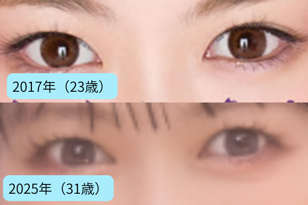 目は奥二重のような自然なラインで、現在のパッチリとした幅広の二重と比べると、やや重ためでナチュラルな雰囲気です。