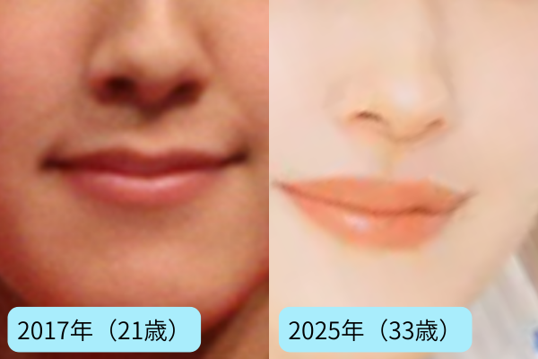 若い頃は厚みが控えめで、口元全体がすっきりした印象でしたが、現在は立体感があり、輪郭もはっきりしています。