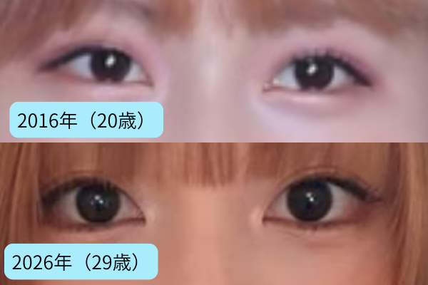 一方2026年は二重幅がよりはっきり見え、涙袋メイクが強調され、まつ毛のボリュームやアイラインがしっかりしていることで目が大きく印象的に見えます。