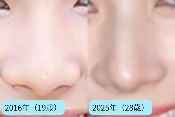 対して28歳の現在では、鼻筋が一本の線のようにスッと細く高く通り、鼻先もツンと鋭く整った造形へと変化しています。