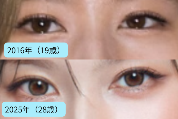 対して28歳の現在では、目頭から幅の広い平行二重へと変わり、目の横幅もより強調された華やかな印象です。